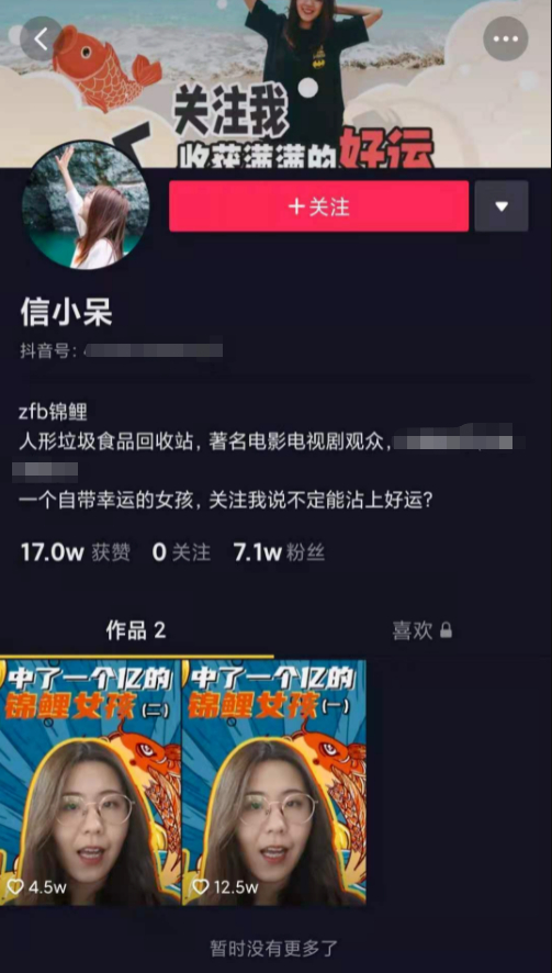 信小呆最新公布的现状引发了网友关注,然而还是有不少质疑的声音表示,她不存在没有工作就收入不足的情况,她发视频讲述个人经历属于“哭穷卖惨”博关注。这两年来虽然没工作,但是她靠着“中国锦鲤”光环的流量收入不菲。