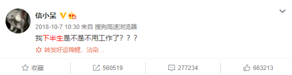 2018年10月7日,在得知中奖后,信小呆难掩激动地发文:“我下半生是不是不用工作了???”