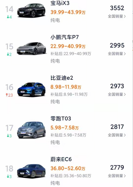 竞争压力还不只是来自互联网造车军团及其盟友。4月份新能源汽车销售榜显示,宝马iX3以3552辆的成绩位列第15位,小鹏P7、蔚来EC6分别以2995辆、2779辆的成绩位列第16位和第18位。