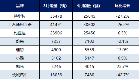 值得注意的是,4月份小鹏汽车销量为5147辆,环比增幅仅为0.9%。蔚来汽车则出现了2.1%的同比下滑。显然,随着竞争的加剧以及基数的提升,新势力们的高增长神话已经不复存在。