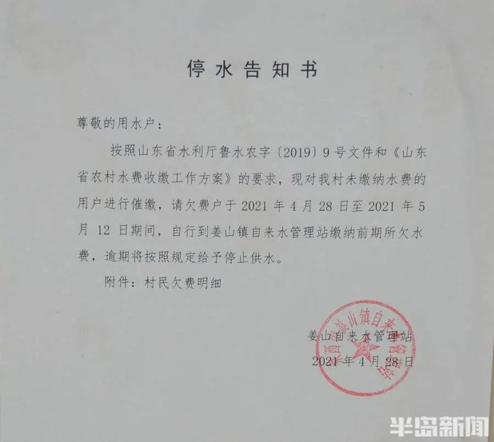 一是停水前,我们根本没有接到缴费通知,虽然张贴了欠费明细,但是贴的位置也不是外面的村务公示栏,而是贴在村委里面的墙上,我们村民没事是不可能跑进村委里去,所以看不到,而且很多村民不在家,也不清楚缴水费的事。