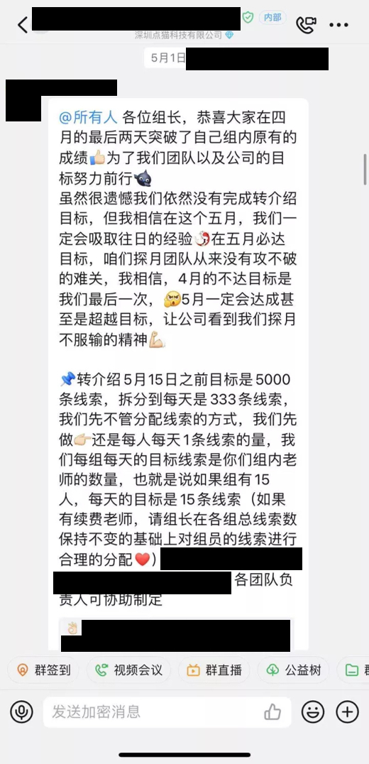 “主要就是因为新学员招不进来。”小A告诉界面教育记者,“就我所了解的,小火箭、探月部门目前都是进新困难,很多老师排不到班级。编程猫要求在职老师们疯狂做转介绍来招新学员,包括五一期间放假也要做转介绍。”
