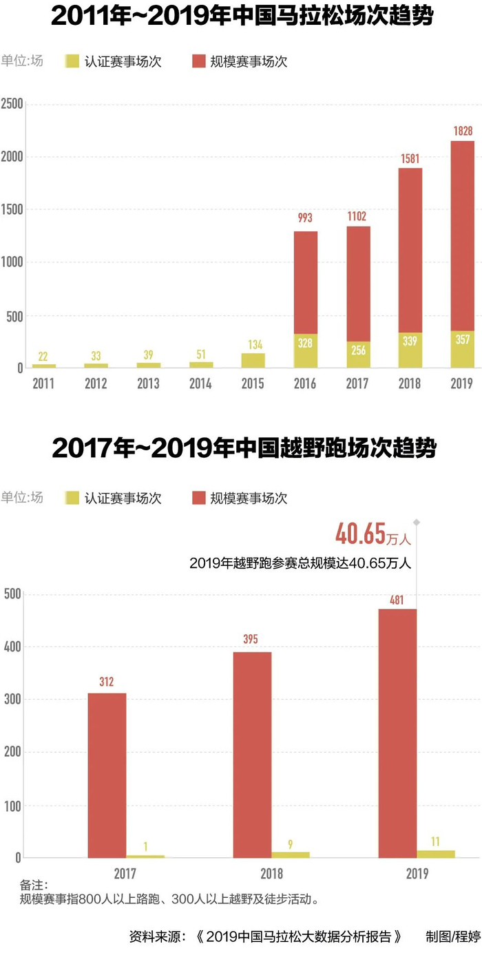 有了国家政策的鼓励,各地都在举办马拉松比赛。中国田径协会发布的《2019中国马拉松大数据分析报告》显示,全国马拉松赛事已由2011年的22场升至2019年的1828场,参赛人数由40万人次升至712.56万人次。