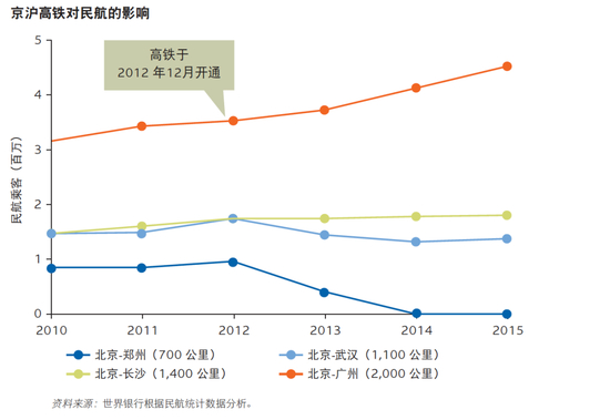 世界银行的研究表明,考虑到高铁的准时性及机场与市中心较远的距离,在中国,高铁产生显著影响的距离可达1000 公里,远超欧洲通常预期的影响。