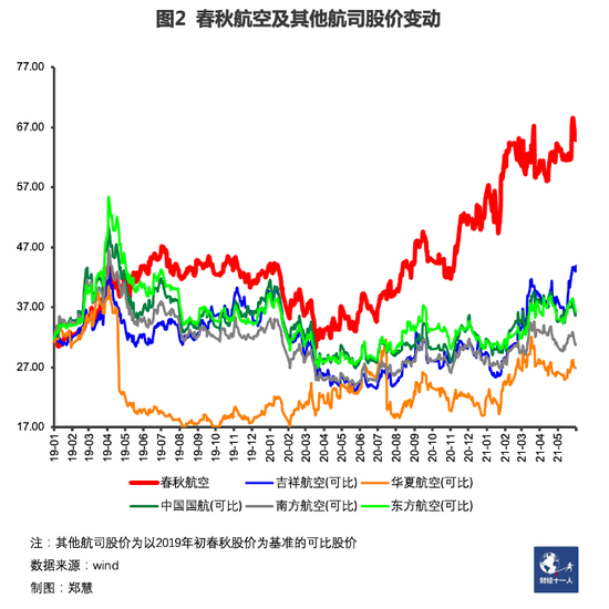 在资本市场上,自2020年初以来,这两家民营航司的股价,均有不同程度上涨。尤其是春秋航空,走出了一轮相对稳定的上升行情(见图2)。