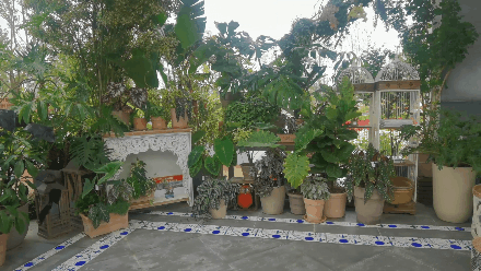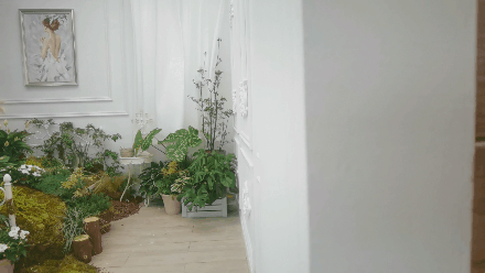 与大门连接的走道两旁,各有一片暖色系花坛和冷色系花坛。在“餐厅”里,餐桌中间便是一片小小花坛,搭配不同颜色的草本植物;“客厅”主打清新自然风格,还有藤类植物缠绕在天花板;“卧室”主打温馨的风格,床上“长出”一片花草,创意独特。