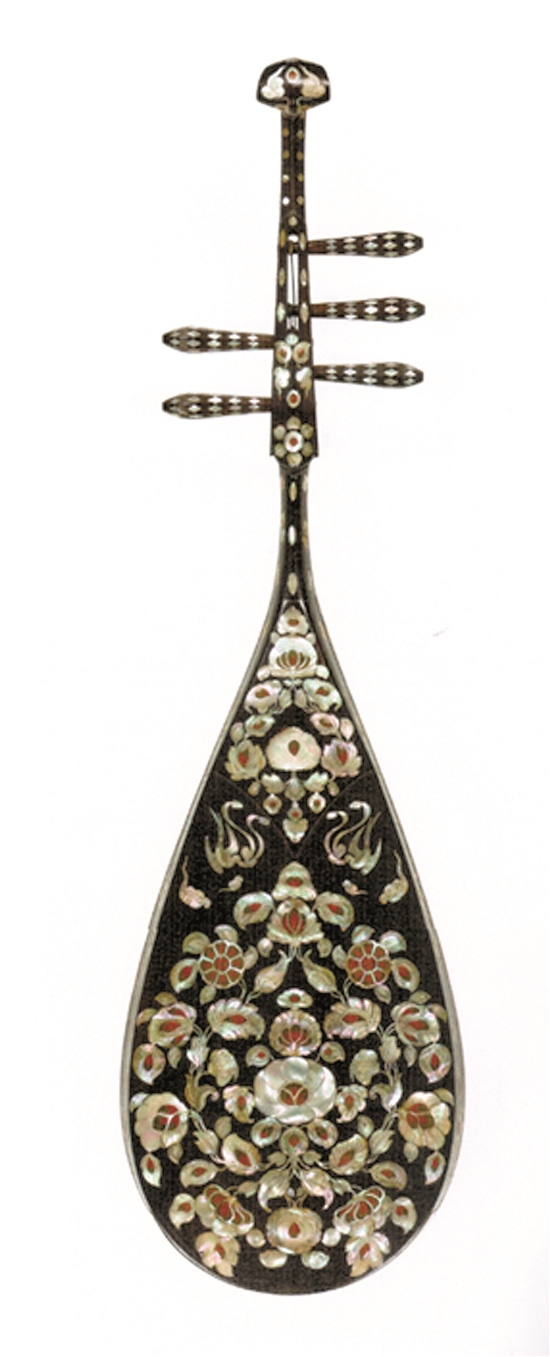 螺钿紫檀五弦琵琶是正仓院里最惊艳的珍宝,是世界上唯一保留的五弦琵琶。琵琶本是一种外来的乐器,“四弦琵琶来自波斯,五弦琵琶传自印度”。但是,五弦琵琶随着佛教传入中国,在唐代以后便消失了。这件琵琶的珍贵之处在于它的用料及工艺,背面一整块都是紫檀,运用了一种“伏彩色”的美术工艺,其豪华性、规整性、对称性都是独一无二的。