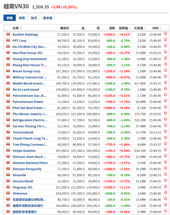截至6月4日收盘,越南VN30指数上涨0.26%,报1508.35点,再创历史新高。该指数在过去的一年内涨幅为82.5%,2021年至今上涨38.14%,是整个亚太走势最靓的市场。