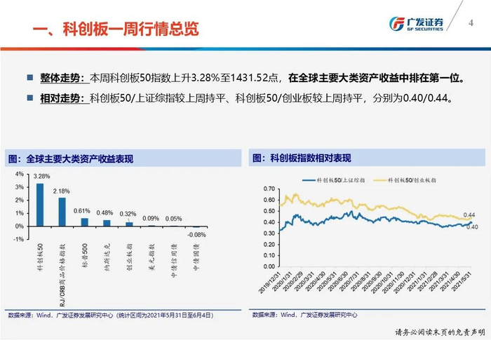 一周行情总览:(1)科创50指数本周上升3.28%至1431.52点;(2)本周日均成交额440.54亿元,较上周上升29.10%;本周日均换手率6.30%,较上周上升1.69pct。