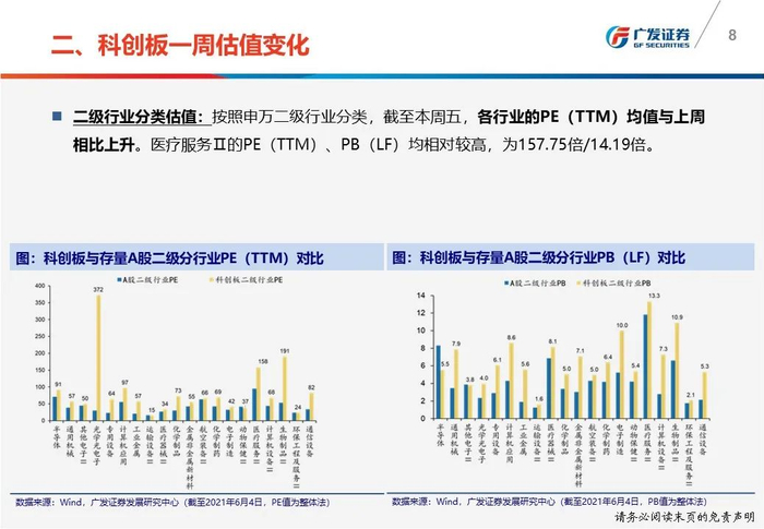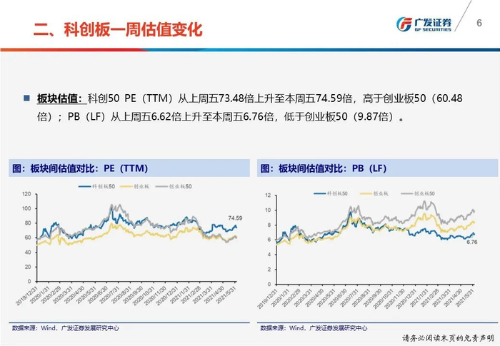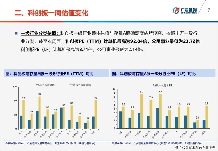 一周估值变化:(1)科创50 PE(TTM)从上周五73.48倍上升至本周五74.59倍;(2)科创板PE(TTM)计算机最高为92.84倍,公用事业最低为23.72倍。