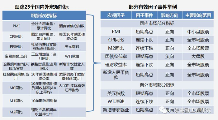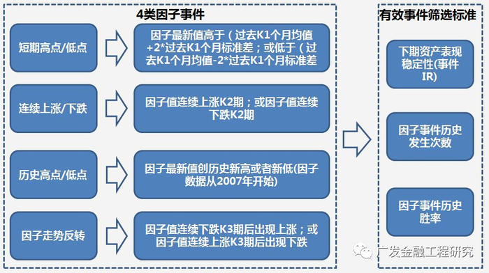 我们尝试利用宏观因子在最近一段时间内的走势作为未来资产趋势判断的依据,我们定义四类宏观因子事件(短期高低点、连续上涨下跌、创历史新高新低、因子走势反转)来表现宏观因子的走势,并从历史上寻找有效因子事件——即对于资产未来收益率影响较为显著的因子事件。