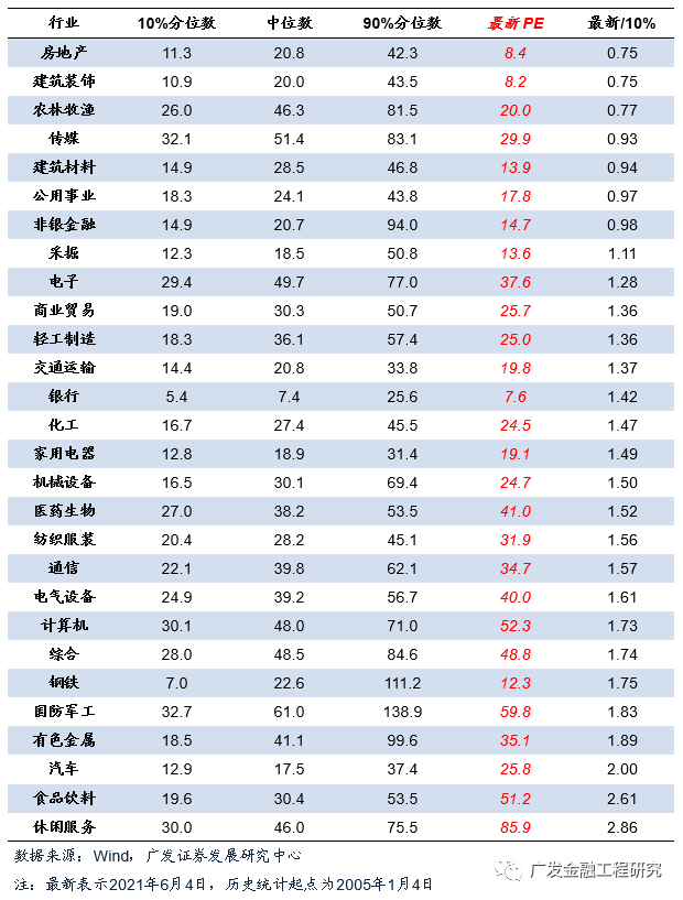 从行业指数看,最新PE距离其历史10%分位数最近的,即最接近历史底部估值的分别是农林牧渔、房地产、建筑装饰、建筑材料和传媒。