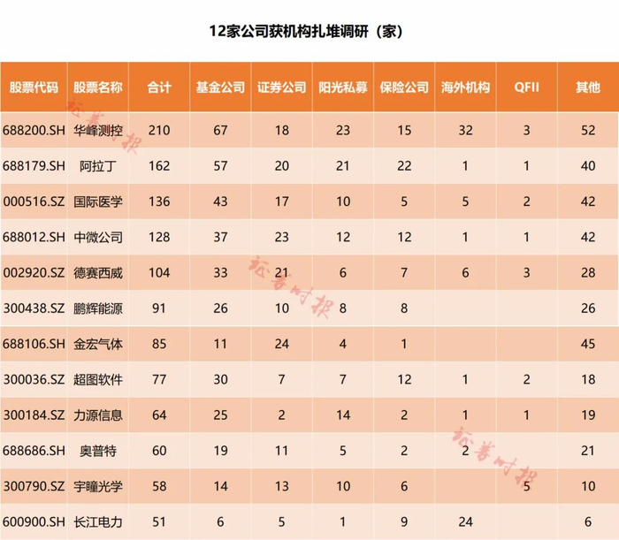 数据显示,个股方面,华峰测控上周累计接待机构达210家,位居首位;阿拉丁接待162家调研机构,排名第二,国际医学接待136家机构,排名第三位。