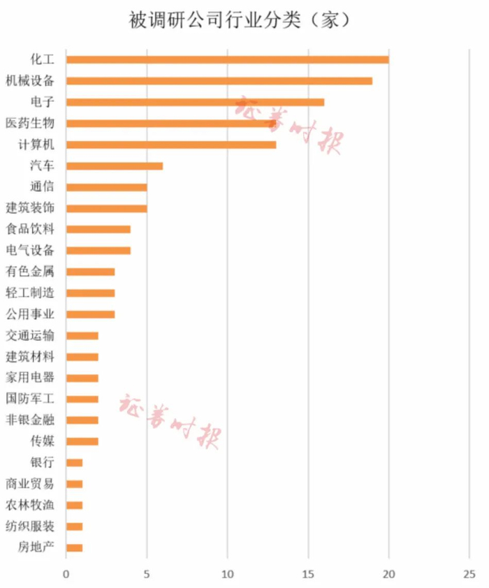 从行业分布来看,上周获调研的公司中,化工行业成为机构调研的重点,共计20家公司获调研。另外,机械设备、电子、医药生物等行业被调研的公司也较多。