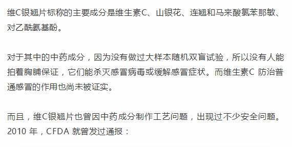 早在2013年,央视报道,香港卫生署就呼吁大家不应购买或服用“维C银翘片”,该产品可能含有多种未标示及已被禁用的西药成分,服用后可能危害健康。