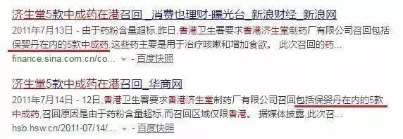 2011年7月,香港某品牌5款中成药在港召回,因药粉含量超标11~45%。