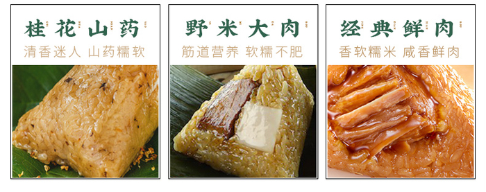 肉粽鲜香、甜粽清香,吃一口就能回想起儿时记忆中的味道,细细品味又能感受到口味上的小创新,诚意之作。