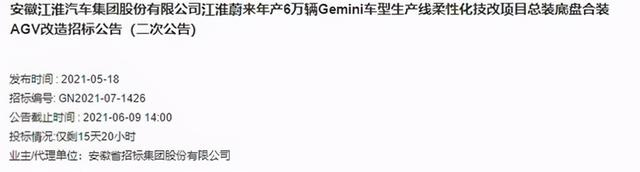 据记者了解,目前上述Gemini车型的开发工作已经开启。今年5月10日,安徽江淮汽车集团股份有限公司对外发布了《Gemini车型生产线柔性化技改项目总装底盘合装AGV改造招标公告》,公告显示,这款车的计划年产能为6万辆。