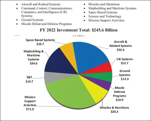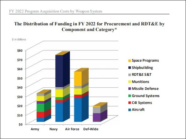 除了裁撤现役兵力以外,美军在2022年也大幅度降低了装备采购费用。在FY2022的财年采购中用于购买新设备的采购资金将下降近6%,至1336亿美元。美国传统上将采购分为9个部分:1.航空器相关系统、2.C4I指挥控制情报系统、3.地面系统、4.导弹防御系统、5.弹药、6.舰船建造和海事系统、7.空天系统、8.科技、9.任务支持活动。9个项目里,只有C4I采购、造船经费、空天和科技四个项目的采购经费有所上涨。