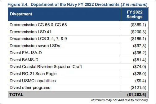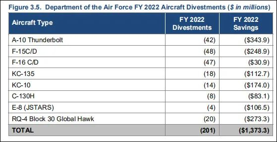 美军计划在2022年退役42架A-10,48架F-15C/D和47架F-16共138架战机,4架E-8“联合星”和全部20架RQ-4“全球鹰”。在海军方面2艘提康德罗加级导弹巡洋舰和4艘濒海战斗舰等。这轮裁军共为美军节省大约25亿美元。尽管美军并没有实际上缩减部队编制,但是考虑到2021年美国空军入列的F-35数量为96架,入列驱逐舰不到1艘,美军的水面舰艇部队与空军机队正式进入规模萎缩时代。
