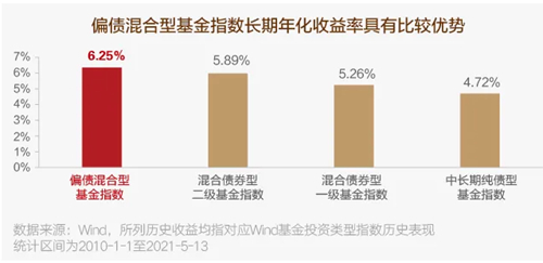 wind数据显示,2010年1月1日至2021年5月13日期间,偏债混合型基金的平均年化收益率为6.25%,领跑债券类基金,也比普通的银行理财产品收益高一大截。
