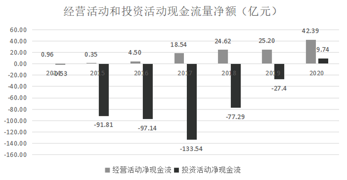 从日常经营活动和投资活动的现金流量对比来看,上市以来日常经营产生的现金流净额为116.56亿元,而投资流量净额则高达417.97亿元,2018-2020年,公司经营遇到困境,无力继续大规模投入,管理层不得以降低了投资规模,甚至开始甩卖资产,因此投资现金流净额在2020年翻正,录得9.74亿元。