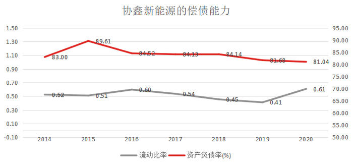 协鑫新能源债务沉重,近五年资产负债率均在80%以上,流动比率从上市以来就一直低于“1”的警戒线。2020年末负债总额364.99亿元,其中有息负债达259亿元,光财务费用就24.5亿元,加权平均的利息率高达9.46%。