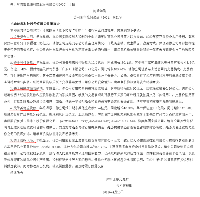 对于2020年的年报,深交所火速发了问询函,涉及到的问题多达五点,除了实控人的违规资金占用问题外,还包括预付账款问题、关联方交易问题、其他应收款问题以及股票的质押问题。