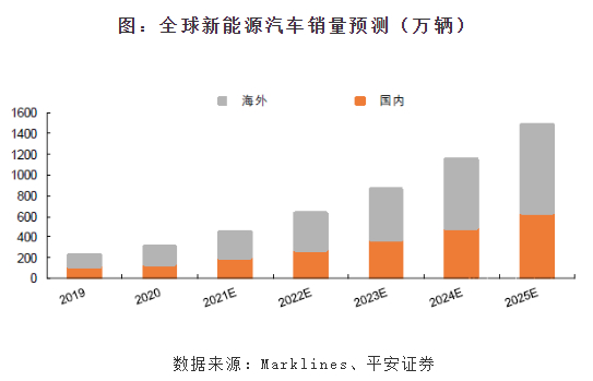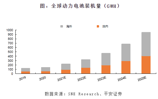 再来看看电池的投资潜力。电池系统是新能源车中成本占比最高的部件,其成本占比接近40%。随着新能源车的普及,动力电池行业规模预计将快速增长。2020年全球动力电池装机量为139GWH,SNE Research预测全球动力电池装机量在2025年或将达到940GWH,2020-2025年复合增速或超过45%。