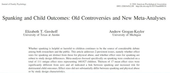 该论文的标题为“Spanking and child outcomes: Old controversies and new meta-analyses”,中文可译为《打屁股及其对孩子的影响:历史争论和最新荟萃分析》,作者为Gershoff和Grogan-Kaylor。