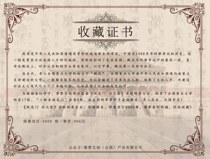 为了迎接到来的高考,紫禁文创特地出品了《跃龙门·状元签》名校邮票大全珍藏册,一次性收录了全国重点大学邮票17枚和《小鲤鱼跳龙门》套票5枚。