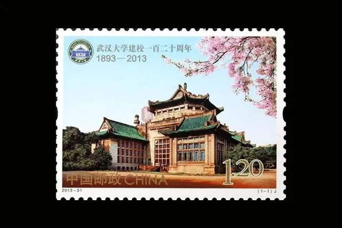 邮票以中西合璧宫殿式的武大老图书馆为主体,青色的琉璃瓦,腾飞的屋檐,将自然环境与人文底蕴高度融合。