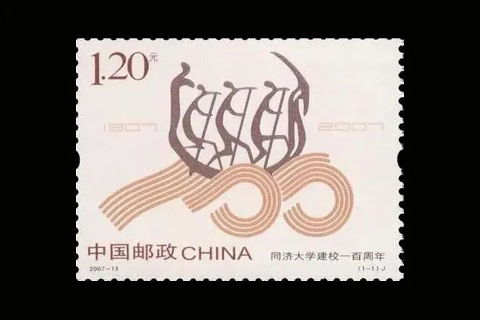 邮票以同济大学校徽中的“三人划龙舟”图案点缀由水纹组成的“100”校庆校徽图案。