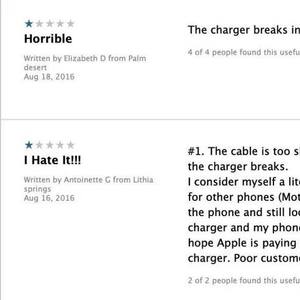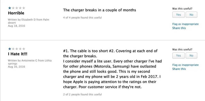 在一个电商中,关于苹果 Lightning 数据线产品页下有着接近 2300 条负面信息,评分也仅仅是一星,在这些评论中,他们有着几乎相同的抱怨,“Lightning 数据线太不耐用了”。