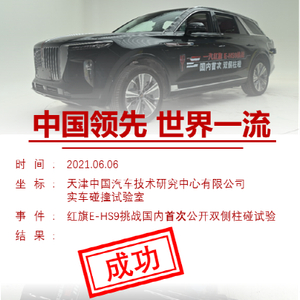 本网讯(王孙斌  赵紫剑)2021年6月6日,红旗品牌旗下首款C+级豪华旗舰纯电SUV—E-HS9 在中汽中心碰撞试验室内进行了国内首次双侧柱碰公开试验挑战并取得圆满成功,央视等百家媒体在现场见证了本次挑战活动。