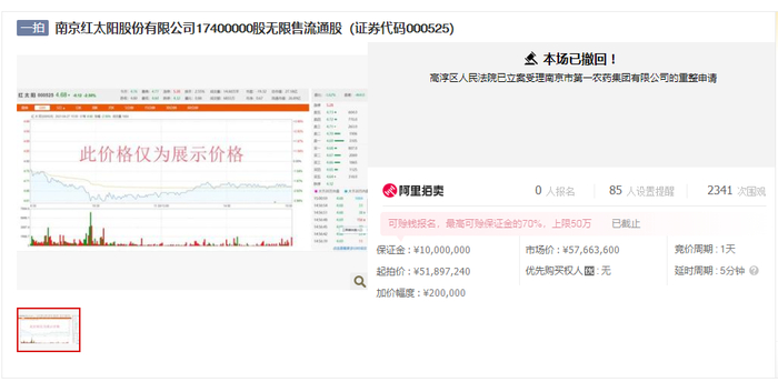 原本6月5日,南一农集团持有总计5.51%的两笔红太阳股权,将因金融借款合同纠纷将被司法拍卖。不过阿里拍卖显示,由于法院已受理南一农集团的重整申请,拍卖已被撤回。