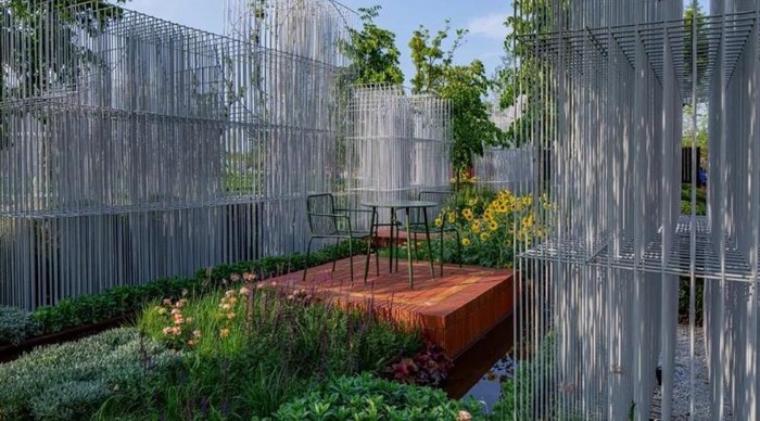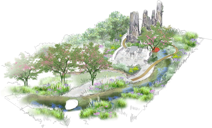 美国设计师Carrie Preston的作品名为“灰粉色花园”,从名字上就能了解这座展园的色调和风格。这里没有色彩鲜艳的花卉搭配,主栽植物是鸡爪槭、风箱果、红皮柳、狼尾草、山桃草、墨西哥羽毛草、百日草、醉蝶花等灰色系和浅粉色系的花草,营造出一种纤细、柔美、飘逸的梦幻效果。