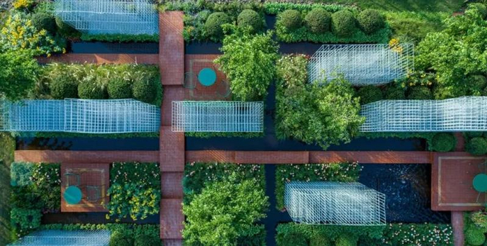 除此之外,国际设计大师园中的其他展园也各有特色:澳大利亚设计师Phillip Withers的作品“我们的时代”,创造出接近崇明原生态的花园环境,倡导回归自然、保护自然的理念;新西兰设计师Xanthe White的作品“幻化”,俯瞰是凤凰涅槃的图案,象征植物、火、土与红砖之间的幻化,象征生命的延续;荷兰设计师Anemone Beck Koh的作品“荷兰酷”,巨大的竹子结构从堤坝上延伸出来,通透的竹材质使得置身其中的游人感受到舒适凉爽;日本设计师杉井志织的作品“彩虹庭”,将现代日式庭院与花卉植物结合,打造七彩花园空间景观;中国设计师杨晋的作品“镜·花园”,通过镜面映射让花园、天空和人融合在一起,体现出人与自然和谐共生的意境。