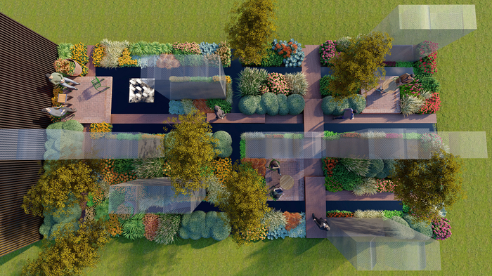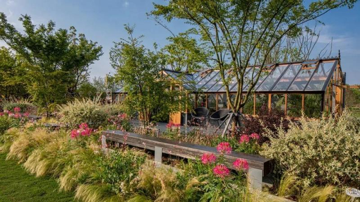 花园前部以植物为主,通过墨西哥羽毛草、粉色山桃草、百日草等植物呈现一个英式花境,微风一吹,草叶“刷刷”作响,花园灵气十足;后部以现代温室为主,辅以具备线条感的室内温室绿植,比如金边虎皮兰、宝莲灯等。温室的科技感十足,顶部天窗无须人力开合,而是根据温度自我调节,温度高了就打开,温度低了就闭合。
