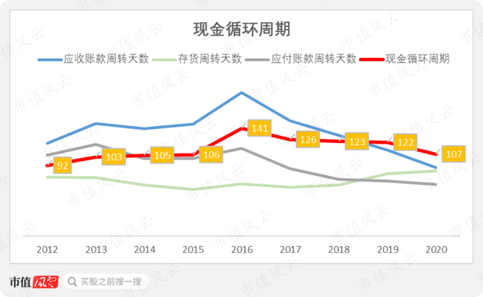 在这三个因子的合力下,公司现金循环周期从峰值的141天降至107天,资金占用大致下降了1个月,值得肯定。
