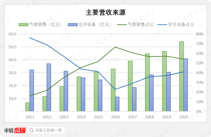 公司的气体销售业务实现了持续增长,从2011年到2020年,气体销售收入占比从最初的16%一路上升到54%,实现了不间断增长,是公司业务成长的核心,同期CAGR达到26%。