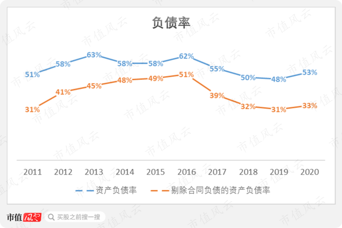 公司资产负债率目前处于近年来的低位,2020年末为53%。而如果剔除掉合同负债,那么同期的负债率仅为33%,较2016年大幅下降18个百分点。