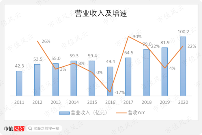 2020年,公司营收首次突破百亿大关,达到100.2亿。