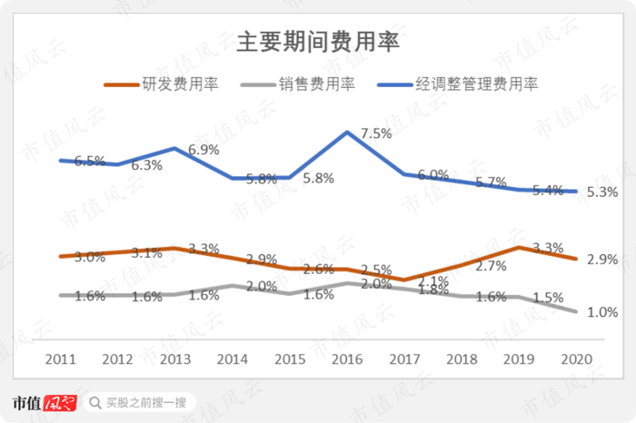 2020年,经调整后的管理费用(注:剔除2018年之前披露金额当中的研发费用)绝对金额是三费当中最高的,也是近10年最高的;但管理费用率也是过去10年当中最低的,为5.3%,主要受益于营收维持较快增长。