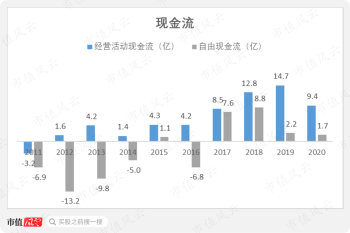 自2017年以来,公司现金流规模上了一个新台阶,2020年为9.4亿。