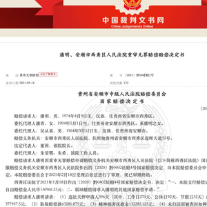 中国裁判文书网近日公布的国家赔偿决定书披露,2021年5月7日,安顺中院依据最高人民法院关于国家赔偿案件中精神损害抚慰金的赔偿新规,认定羁押396天给潘明造成了精神损害的严重后果,精神损害抚慰金应按人身自由赔偿金总额的50%进行赔偿。最终,潘明获得人身自由赔偿金137313元、精神损害抚慰金68656.5元及辩护、代理费等,合计人民币25.8万余元。