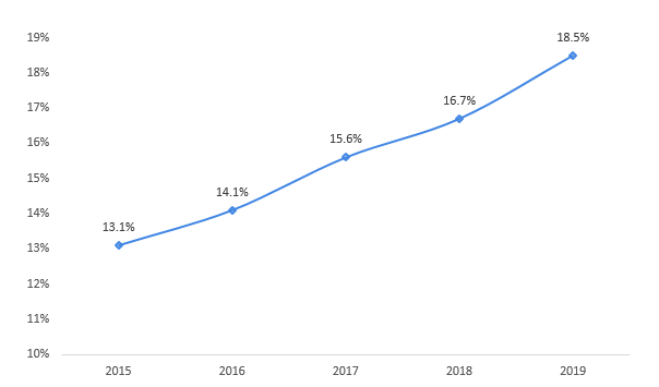 国家统计局 图表4:2015-2019年中国一人户占家庭户数比例(单位:%)