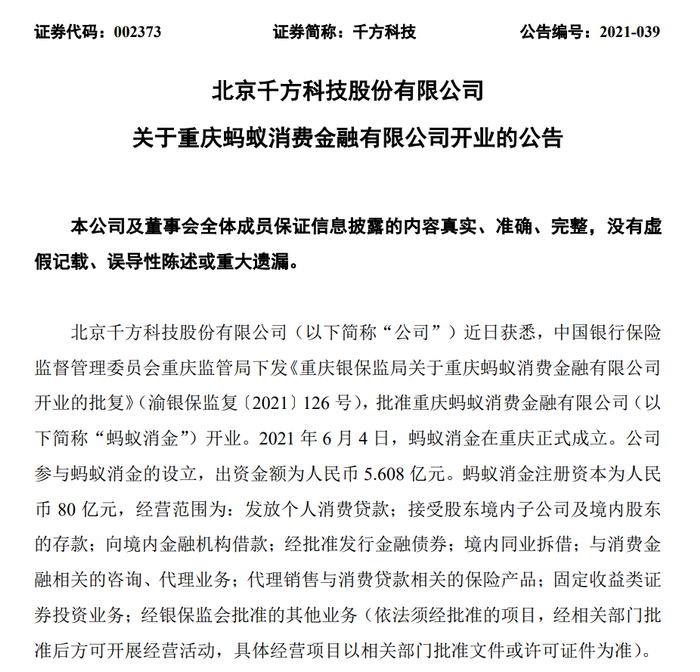 6月7日晚间,千方科技公告, 2021年6月4日,蚂蚁消金在重庆正式成立。公司参与蚂蚁消金的设立,出资金额为人民币5.608亿元。互相佐证的是,工商信息最新的更新情况也显示,6月4日,重庆蚂蚁消费金融有限公司成立,法定代表人为黄浩,注册资本80亿元人民币,工商信息显示,该公司经营范围包含:发放个人消费贷款;接受股东境内子公司及境内股东的存款;向境内金融机构借款;经批准发行金融债券等。