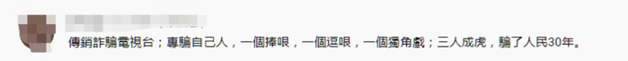 “传销诈骗电视台;专骗自己人,一个捧哏,一个逗哏,一个独角戏;三人成虎,骗了人民30年。”