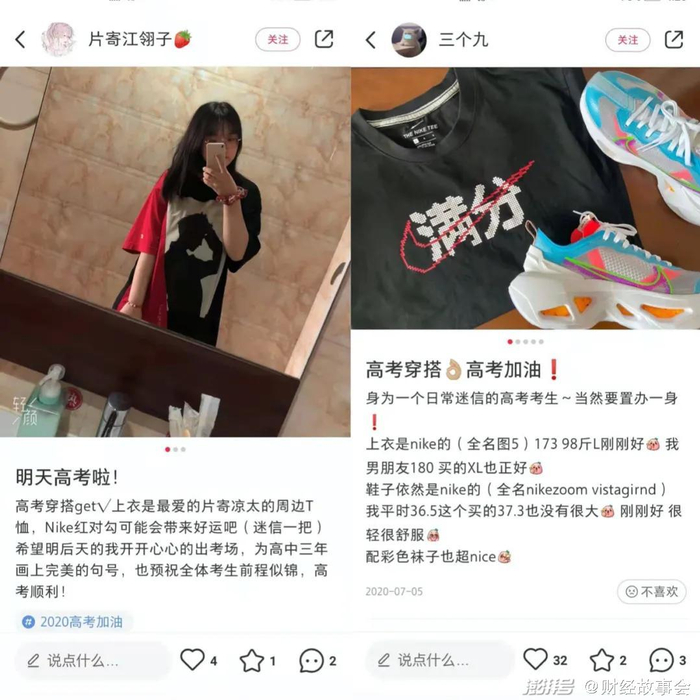 不止家长,也有不少考生愿意选择讨个好彩头。在小红书上,因为耐克Logo像红对勾而选择耐克鞋、耐克T恤走上考场的考生也不少。